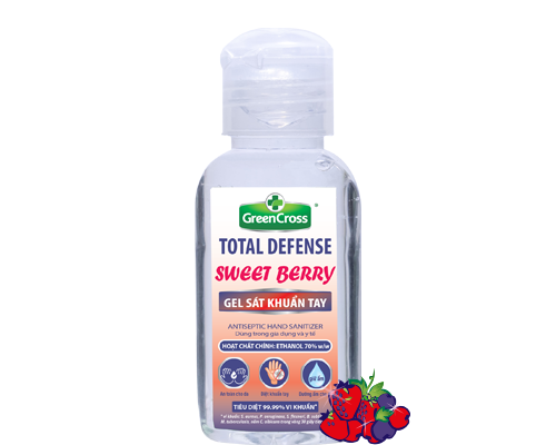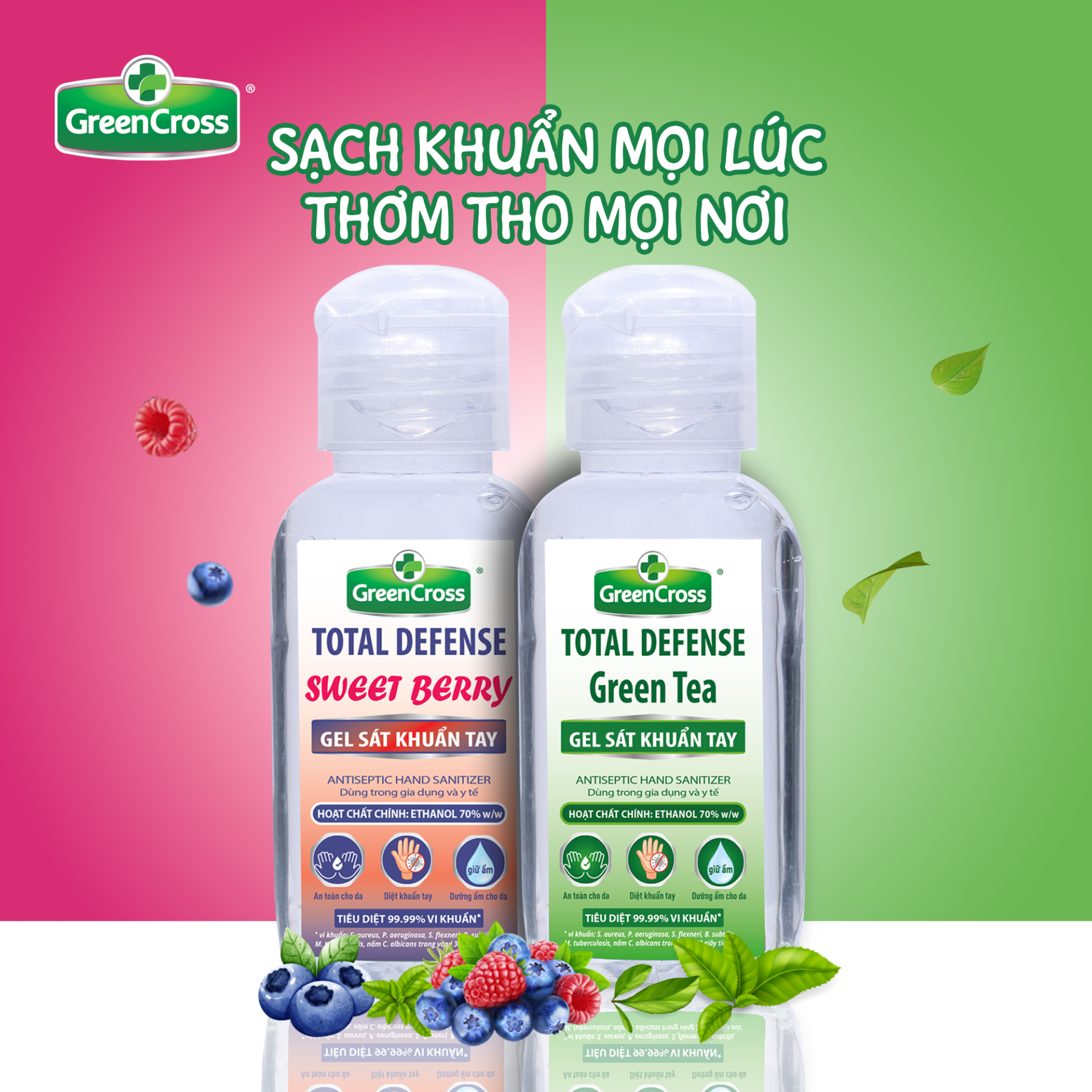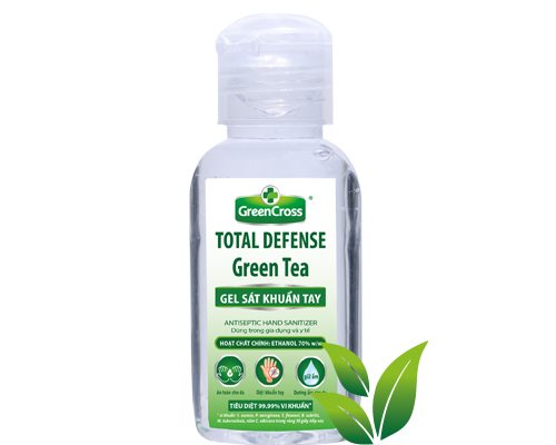 Green Cross Total Defense - Gel sát khuẩntay thuộc ngành hàng nước rửa tay khô, dạng gel, với hoạt chất chính là ETHANOL 70%w/w, giúp diệt khuẩn 99.99%*