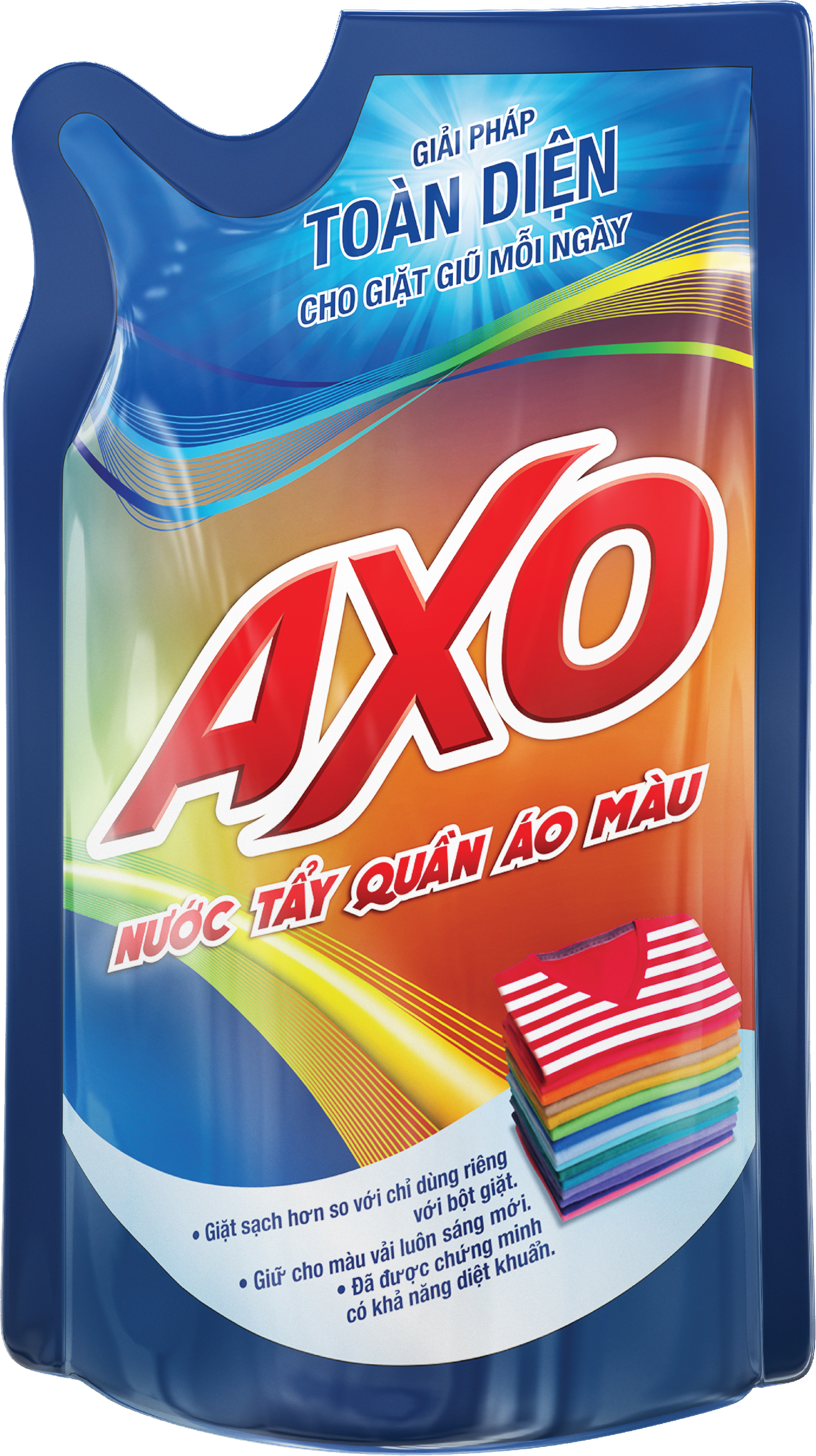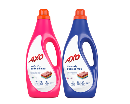 Nước tẩy quần áo màu AXO giúp đánh bay các vết bẩn cứng đầu trên quần áo màu mà không làm mất màu quần áo, diệt khuẩn 99.99%, không mùi Javel, giúp khử mùi hiệu quả