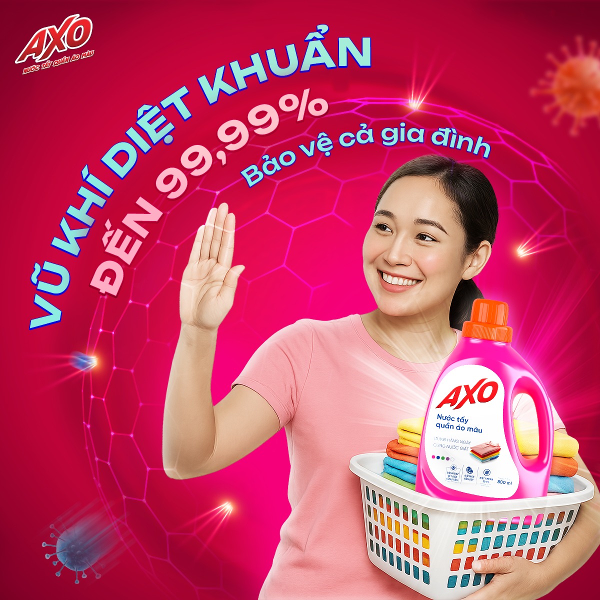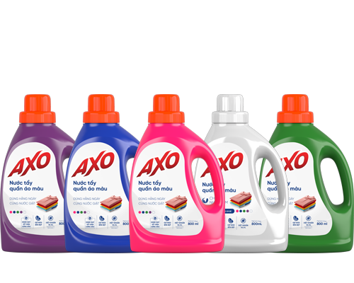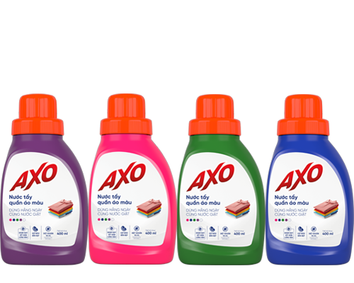 Nước tẩy quần áo màu AXO được sản xuất tại Việt Nam theo công nghệ và công thức tại Philippine, giúp diệt khuẩn 99.99%, tẩy sạch các vết bẩn cứng đầu mà không làm mất màu quần áo, không có mùi Javel.